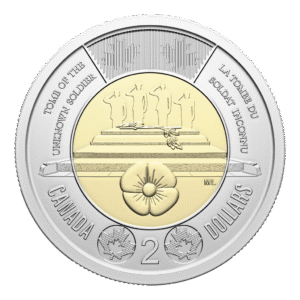 The uncoloured version of the Mint’s $2 coin honours the 25th anniversary of the repatriation of Canada’s Unknown Soldier. Of the three-million-coin mintage, one million are uncoloured and two million feature a red Poppy.