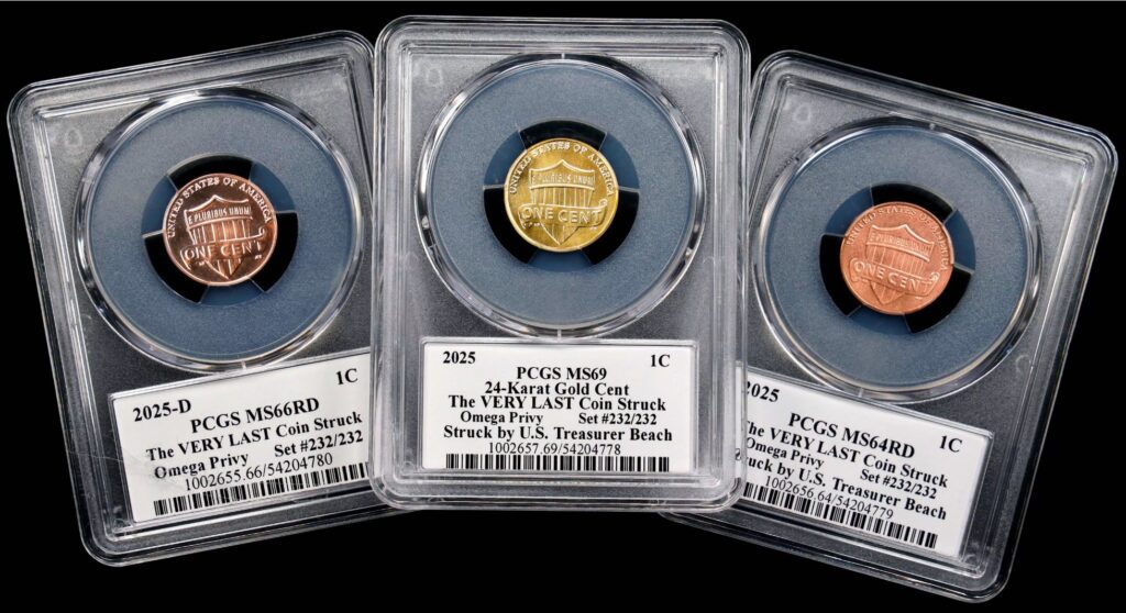 The sale offered 232 three-coin sets, each containing a 2025 cent struck at the Philadelphia Mint, a 2025-D cent struck at the Denver Mint and a 2025 cent struck in 24-karat gold at Philadelphia. Each coin carries a small “Ω” privy mark — the final Greek letter, Omega — intended to signal the capstone of a two-century legacy that began in 1793 with the Chain Cent.
