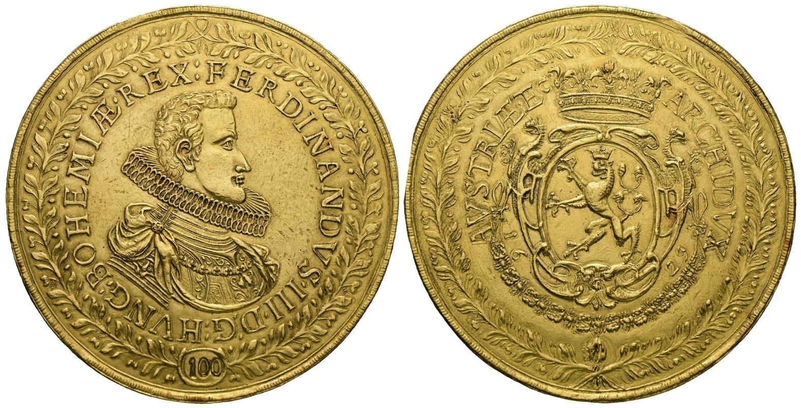 • A 100 ducat gold coin of Ferdinand III of Habsburg, dated 1629, weighing 348.5 grams of fine gold. Unseen at auction since before World War II, the coin is estimated at CHF 1.2 million (approx. £1,048,854 / $1.8 million CAD).