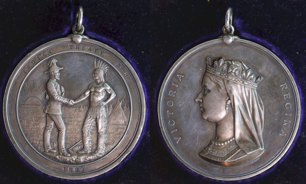 Offered as Lot 1 in the current sale, the Treaty No. 8 medal came directly from the descendants of James Andrew Joseph McKenna, a key figure in the 1899 negotiations alongside Indian Commissioner David Laird and James Hamilton Ross. Representing more than 30 First Nations, including the Fort McMurray First Nation #468, the medal was described as extremely scarce, with this example marking its first appearance on the public market. Estimated at $75,000–plus, the piece moved well past expectations in the opening session.