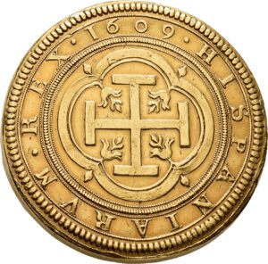 Established with equipment and expertise imported from Hall, Tyrol, the mint combined state-of-the-art machinery with meticulous hand-finishing. The 1609 Centén is described in the catalogue as the crowning achievement of this mint and as the product of some of the realm’s leading specialists, including engraver Diego de Astor, treasury official Luis Jerónimo de Cabrera and assayer Melchor Rodríguez del Castillo, whose “C” mark guarantees the coin’s purity.