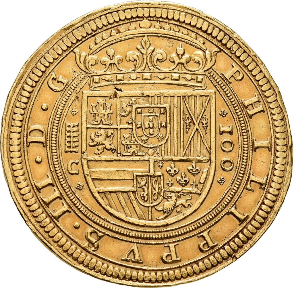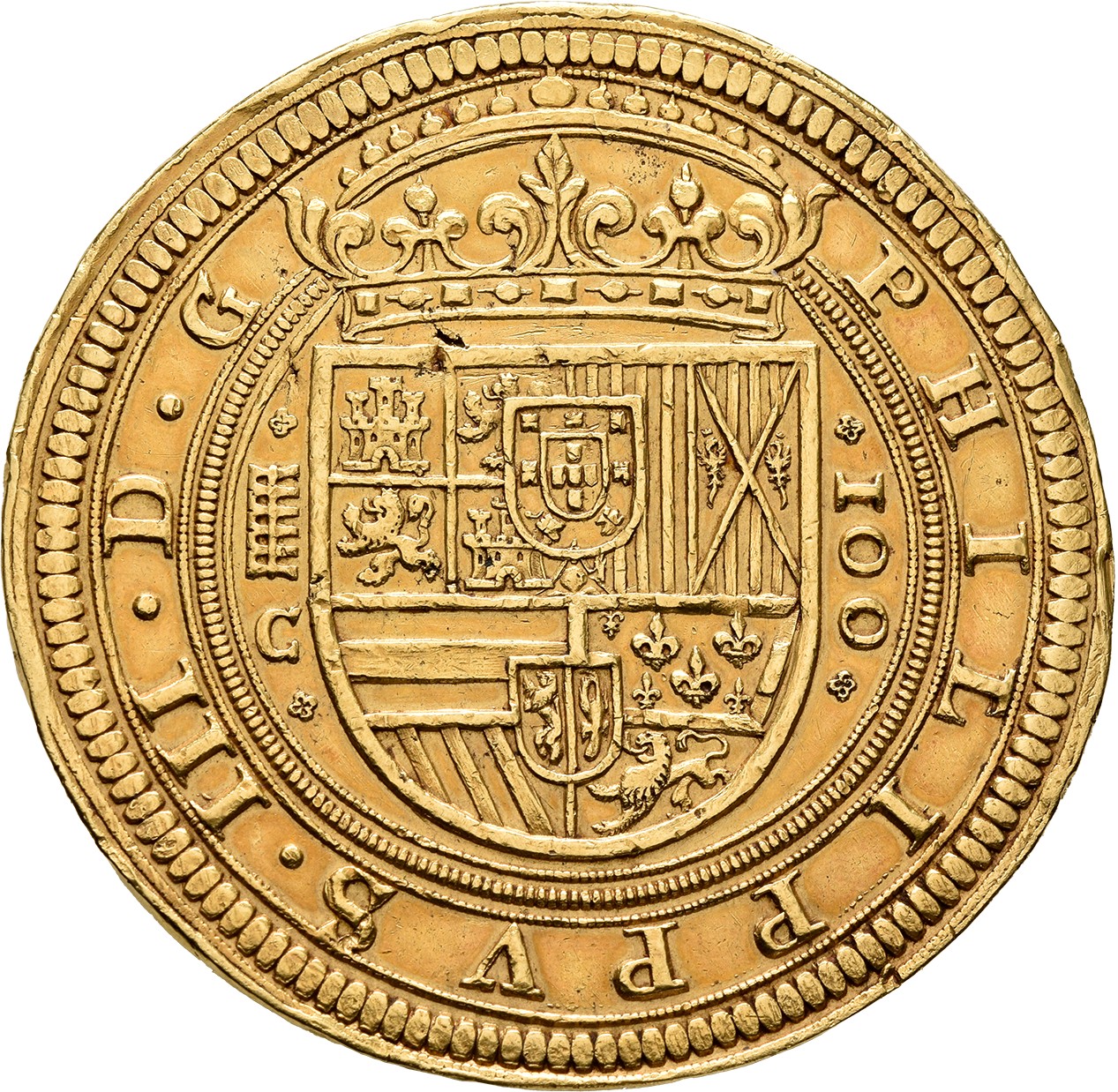 Struck during the reign of Philip III, the massive gold piece was never intended for circulation. Instead, it was created as an elite presentation item designed to showcase the wealth, reach and political ambitions of the Spanish empire at the height of its global influence.
