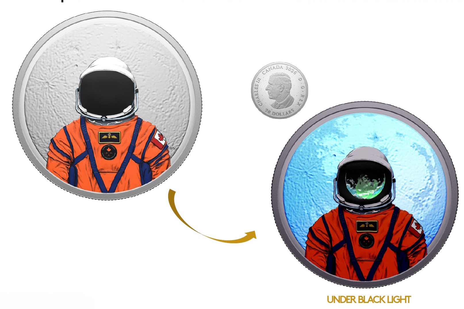 Limited to a mintage of 7,500 pieces, the coin incorporates a black light feature that adds an interactive element. Under normal lighting, the coin presents a fully engraved design featuring a selectively coloured portrait of a Canadian astronaut backed by the Moon. When viewed under black light, hidden details are revealed as the lunar surface glows and the Earth appears reflected in the astronaut’s visor. The effect is activated using the included black light flashlight, allowing collectors to recreate the iconic view astronauts hope to witness from lunar orbit.