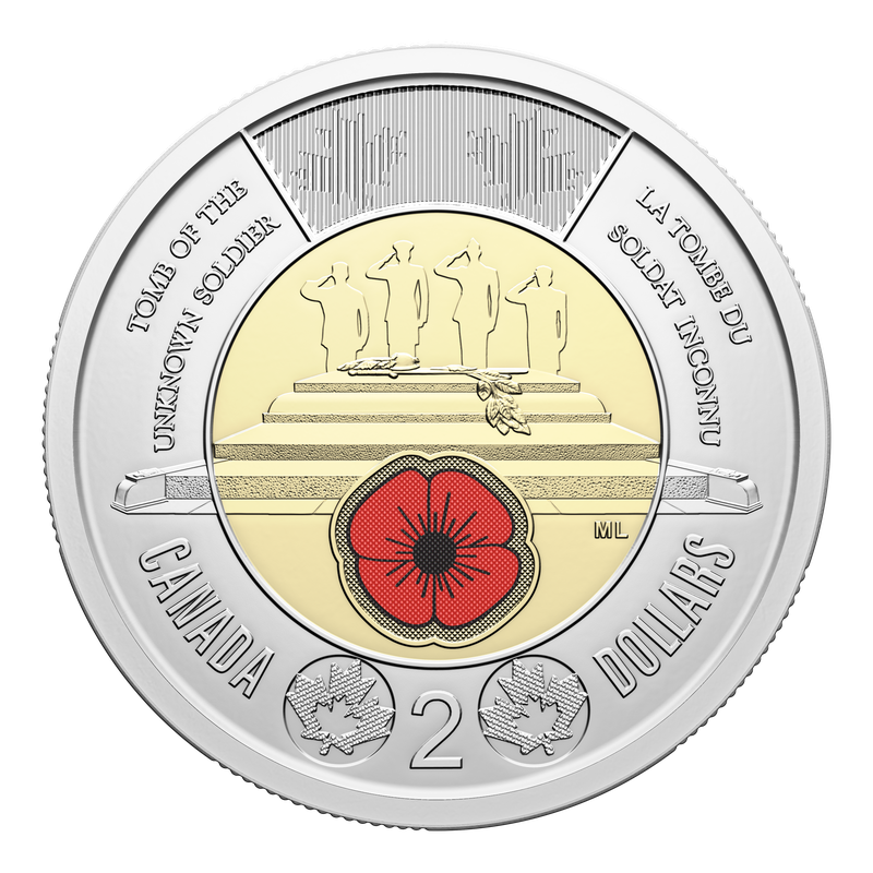 The uncoloured version of the Mint’s $2 coin honours the 25th anniversary of the repatriation of Canada’s Unknown Soldier. Of the three-million-coin mintage, one million are uncoloured and two million feature a red Poppy.