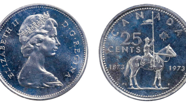A 1973 Canada 25-cent Large Bust, graded ICCS MS-66 and estimated at $6,000-$7,000, appears as Lot 123 and is considered the highlight of St. George Auctions’ inaugural sale.